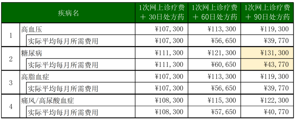 糖尿病网上诊疗所需的平均费用(根据处方内容会略有变动)