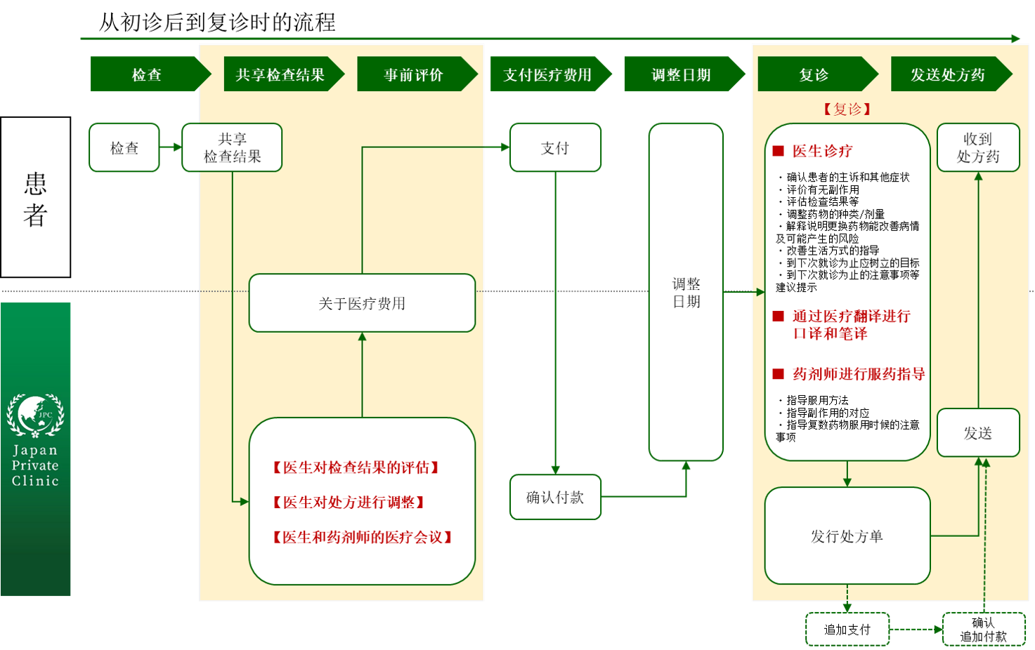 如果您在复诊之间进行了常规检查,请通知我们,与我们共享检查结果。 通过此检查结果,我们会与初诊时候进行的事前评价一样进行评估。我们将评估治疗是否顺利进行,是否有何不妥。 此外,我们将考虑在复查时预计的处方内容(包括药量的变化),并向您发送更新后的“医疗费用信息”。