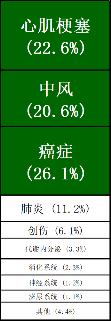 癌症占死亡原因的25%以上,前五位癌症是肺癌、肝癌、胃癌、结肠癌和乳腺癌。